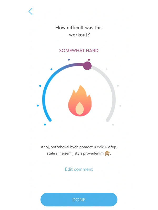 Po dokončení tréninku klient ohodnotí náročnost dané tréninkové jednotky a také může zanechat poznámky pro sebe či pro trenéra, veškerá data z tréninku se uloží do klientovi karty "progress".